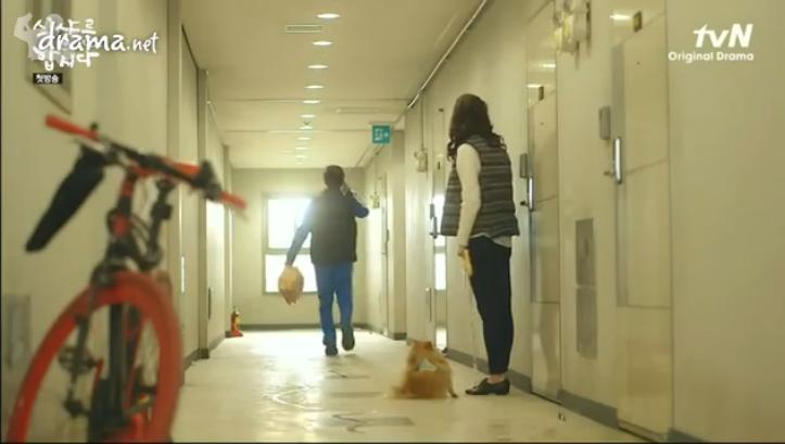 Goo Dae-young is seen talking on the cell phone with yet another woman while taking out the trash that also happens to be leaking. Lee Soo-kyung who is planning to walk her dog, Barassi, also exits out of her apartment at the same time as Goo Dae-young is taking out his trash. She enters the elevator with him and glares at him while he converses with the woman on the phone. A few seconds later, they both discover Barassi licking the trash bag to where Lee Soo-kyung apologizes and says that she’ll clean the mess that Barassi made up. Unexpectedly Goo Dae-young just bluntly states, “Go ahead” and walks out of the elevator like nothing. HAHAHAHA. Freaking Goo Dae-young, you would.