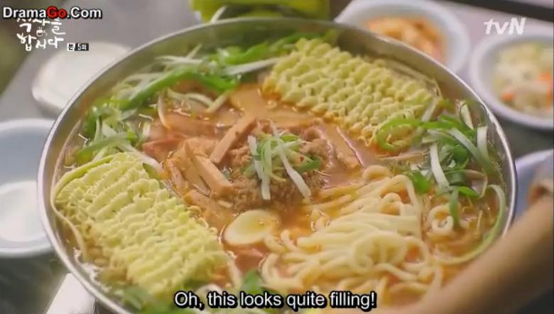 Finally the budae jjigae arrives so they all dive in and start eating the delicious meal.
