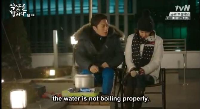 Soo Kyung and Barassi decide to go outside to get some air so when they arrive at the rooftop of the building, Dae Young is seen there cooking some ramen noodles. They sit next to each other while waiting for the ramen noodles to cook. Soo Kyung is uncomfortable sitting too close to Dae Young so she moves a bit, but he brings her back to her original position by putting his arm around her and scolds her to not move since it’ll only make the ramen noodles cook slower. Haha, too cute.