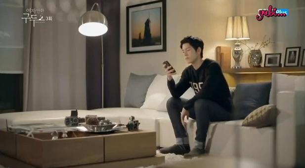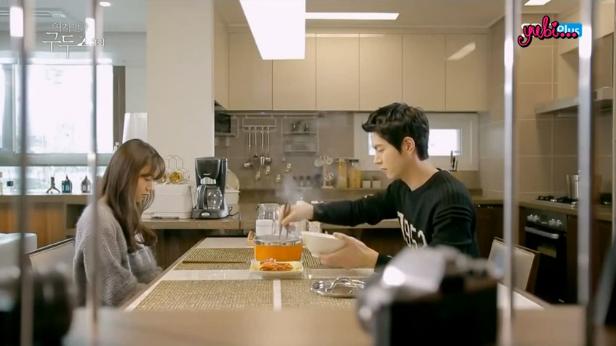 Episode 3 starts off with an anxious and panicky Ji-hoo putting back on her clothes (she woke up with just a tanktop on). Because she’s rushing, she’s careless of the noise she’s making so Tae-soo, who’s in the kitchen, assumes that she has awakened. Haha, he got you Ji-hoo! Ji-hoo steps out of the bedroom observing the living room, amazed and fascinated. As she looks around the living room, her eyes eventually land on Tae-soo who’s busy making breakfast.
