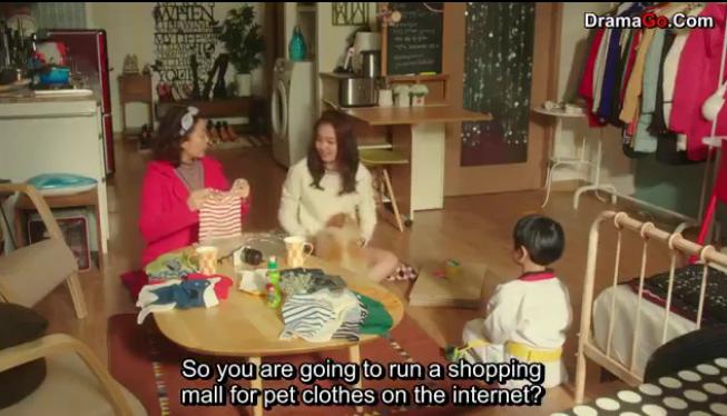 Jin Yi is planning to open a business on the internet that has to do with making pet clothes. She is thankful to Barassi who was able to make all of this possible. Kyung Mi’s youngest son gets jealous of Barassi and tries to her attention by standing up and spinning around the same way that Barassi did as well. LOL. While spinning around, he falls flat on his face (I forgot to mention that he’s wearing his taekwondo uniform which makes it even funnier). Hahaha. Jin Yi asks for Kyung Mi to stop yelling at her son and to help her. Meanwhile, the son takes Barassi to the restroom where he scolds Barassi for hogging up all of Jin Yi’s love. AAWWWWWWWW.