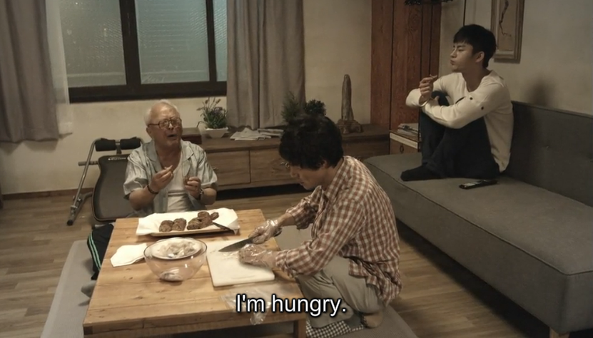 The conversation is interrupted by Grandpa though who Min Suk’s father has to constantly scold so that he can stop eating so quickly. Grandpa also gets scolded for almost eating the raw fish that Min Suk’s father is cutting, but that doesn’t stop Grandpa for he ends up stealing some and running away with them to eat it. Haha. Grandpa is just way too cute!