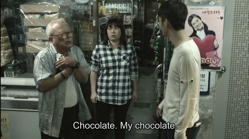 It turns out that Grandpa had stolen chocolate from a convenience store nearby and won’t pay for it so he gets into an argument with the owner. Min Suk comes in time to rescue Grandpa and pays for the chocolate instead. Now that he’s gotten his chocolate, Grandpa is happy and content and walks back home with Min Suk while eating it deliciously. He reveals that he bought the chocolate because he wanted to give it to Hyung Suk since Hyung Suk likes eating chocolate. Aww, how cute. They reunite with Father and return home safely. Min Suk follows them from behind when he sees a taxi park right in front of their house. He focuses on the person exiting out of the car hoping it’ll be Hyung Suk, but grows disappointed when it turns out to be a random drunk guy.