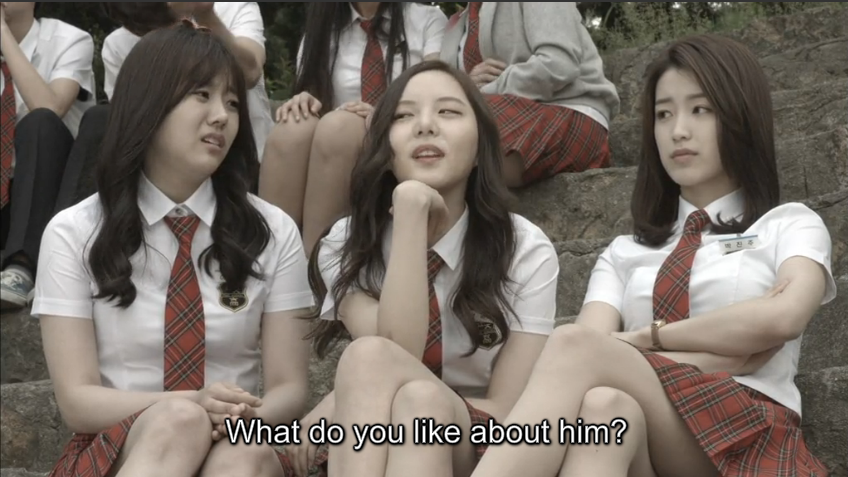 Yoo-Ah takes the opportunity to spazz about Min Suk and explains that she likes him so much because he’s sexy, athletic, and because of his kind eyes. HAHAHA. That’s like totally me talking about Yoseob or Jimin. Her two other friends also enter the conversation and compliment the guy that they have eyes for. Haha, they’re totally calling dibs.