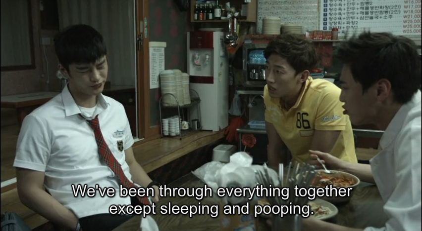 Min Suk changes back into his school uniform like how he does every time he gets out of work and walks back home, but he comes across Soo Young and Yoo-Ah who has just exit out of a convenience store and is walking towards his way. He double checks to see if it’s Soo Young and when it really is her, he sprints to go hide behind a wall, afraid to get caught by both Soo Young and Yoo-Ah. When they’re finally gone, Min Suk suddenly feels a hand hit his head from behind so he turns around to find his Grandpa there. Min Suk can only focus on Soo Young though and realizes that it might not be such a good idea to be living in the same neighborhood as ‘Popcorn’ – it’s actually really dangerous. Speaking of dangerous, Grandpa starts to repeat the word “dangerous” in English multiple times and catches the attention of Min Suk who realizes that Grandpa is speaking in English. Haha, omg, too cute. Min Suk suggest that they go home now that they’ve gotten some fresh air, but when Grandpa refuses to go, he has to persuade his grandpa that he’ll buy him chocolate to get him to go home. Seriously, too adorbs.