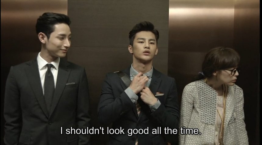 The next morning, Soo Young rushes to get on the elevator so she won’t be tardy to work, but stops when she notices Director Yoo standing at the elevator she plans to get on. Because she’ s still embarrassed over what happened on that night she put on a drunken fit, she can’t seem to confront Director Yoo face on and avoids him at every opportunity she gets. She hides behind a wall and debates as to whether she should just be brave and join him or take the stairs. She tells herself to just act natural because she’s a “cool, modern woman” and ends up walking out from behind the wall towards the elevator door that Director Yoo is standing in front of. When she stands next to him, she tries to make the situation not awkward by starting a conversation with him that he has no interest in. Seeing that he’s careless about the topic she’s talking about, she then brings up the incident the other day where Min Suk was covering Soo Young’s mouth while holding tightly onto the doorknob (the end of episode 2). She clarifies the incident and wishes that he wouldn’t misunderstand, but Director Yoo attacks, “I’d have to be interested in order for there to be a misunderstanding.” OH HAIL NO. THIS GUY. It’s okay Soo Young, you don’t need him. You already have Min Suk. Haha.