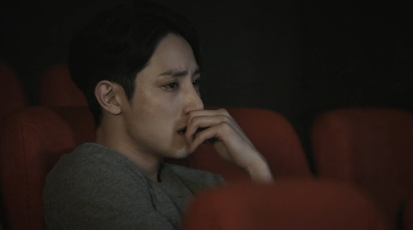 That’s when we hear an over voice from Soo Young who talks about her favorite movie ‘Serendipity’ and why it’s such a memorable movie for her. “I like a movie titled ‘Serendipity.’ Two years ago, I went to a small theater that played that movie and saw him for the first time. Through an unrealistic coincidence, the main characters meet in clandestine manner. I must have still been young for I dreamed of such love.” We then see Soo Young crying in an empty theater over the movie ‘Serendipity’ that is playing on the big screen. She assumes she’s alone in the small theater until she looks around the theater to find herself accompanied by Director Yoo who is also in the same theater as Soo Young and crying over how beautiful the movie is (this was two years back).