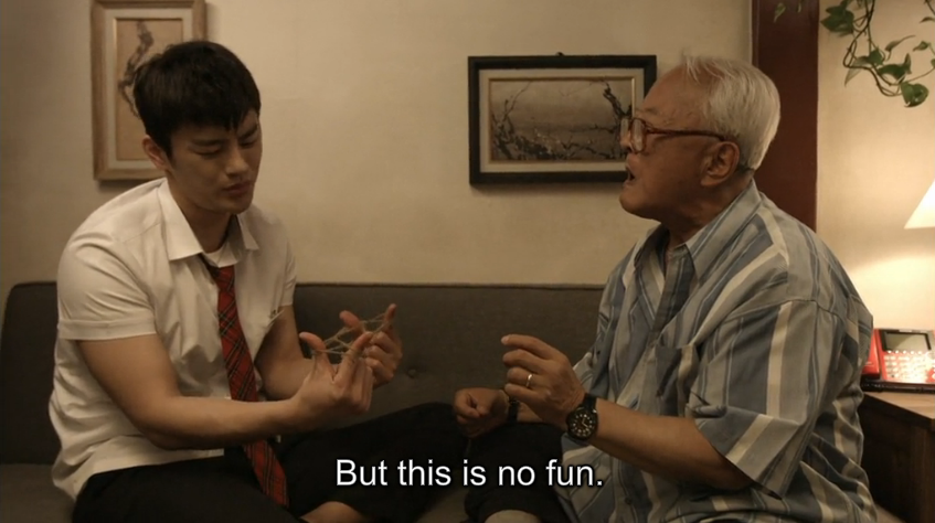Min Suk arrives home, feeling guilty over what he did today so he heads straight to his bedroom even though Grandpa had stayed up to wait for Min Suk so they could play some Cat’s Cradle together. But Grandpa isn’t the type to give up easily (as we witnessed when he refused to give up his chocolate in episode one, haha) so Min Suk decides to play a round of Cat’s Cradle with his Grandpa. While playing the game, Min Suk confides in his Grandpa and expresses his feelings of guilt and shame to his Grandpa saying, “I think I made a mistake with someone today. It’s not like I did it on purpose, but it bothers me. I just feel bad…” He goes on to complain about how he has to do a presentation the next day and also has a hockey game as well. “All of a sudden, my life became so complicated, ” Min Suk articulates. Grandpa’s random but adorable laugh cheers Min Suk up a little though and they finish their game of Cat’s Cradle. Aw, how cute.