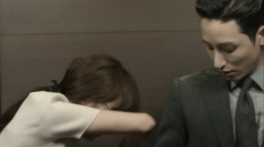 While walking back to the Retail Department after getting some copy paper, Soo Young ponders over her regrets and wishes that she can just turn back time. She’s reminded of how she bit Min Suk’s hand the night before and wishes that she can turn back time so that that incident didn’t occur. She’s about to enter the elevator that she had been waiting for to open, but rushes into another elevator when she finds out that the elevator she had been waiting for is already occupied by Min Suk. Things just aren’t going right for her that morning as she ends up in the same elevator as Director Yoo and spits at him the powder from the donut she stuffed in her mouth before running into the elevator.