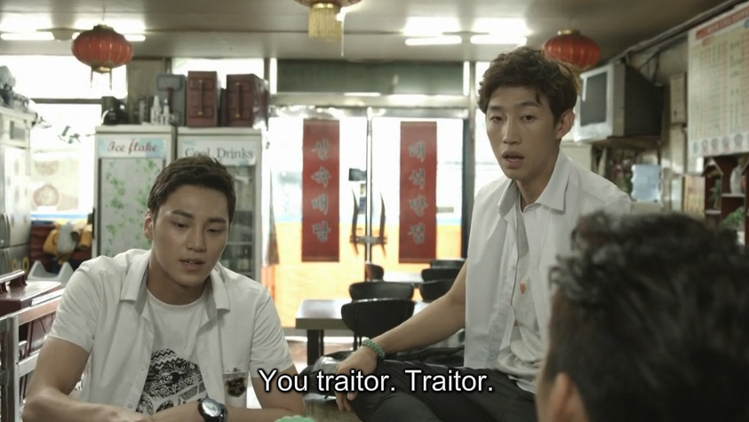 At the restaurant that Min Suk’s two best friends own and has been managing, he explains to them that he’s replacing his brother as the Director for now which his two friends cannot believe. They accuse him of being a traitor and lush out their anger on him since they had to find out about his secret themselves.