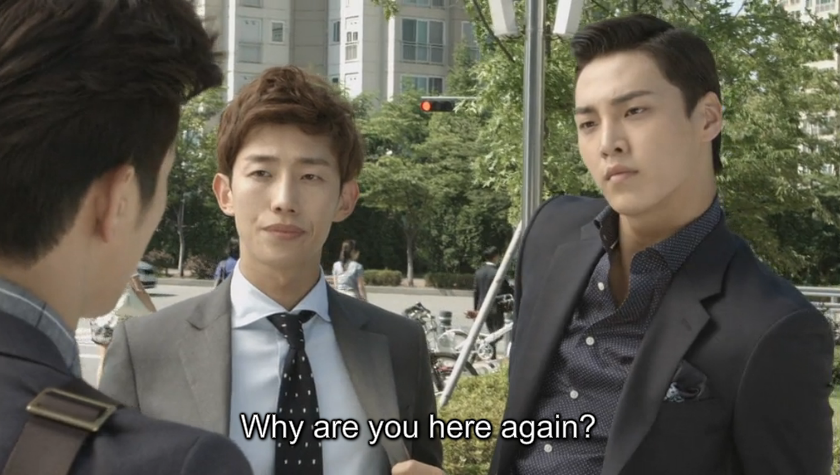 The atmosphere is intense as Min Suk confronts Director Yoo and reveals that he knows Director Yoo was the person who told the General Affairs Team Leader to fire Soo Young. Director Yoo denies the accusation though, but Min Suk is persistent and remains furious at Director Yoo, even accusing him of being a back stabber. He continually questions Director Yoo then stops when he finds out that it was Director Yoo who persuaded the General Affairs Team Leader to get rid of Soo Young when Director Yoo asks, “What’s the big deal of letting a contractor go?” Min Suk reveals that Soo Young is an important person to him so he won’t let something like this go so easily.