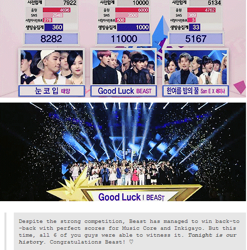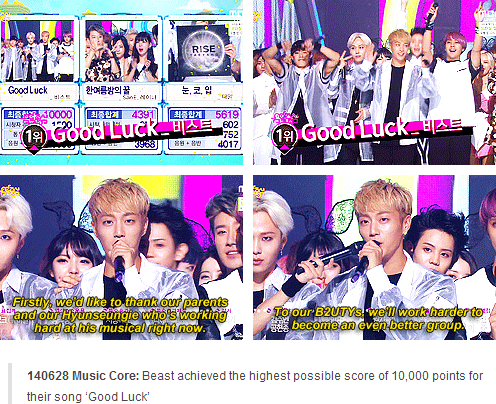 These two pictures here support BEAST’s win on Music Core where they achieved a maximum score of 10,000 points. They are now ranked first among all the winners on Music Core with the most amount of points and the only group being able to have gotten a perfect score.