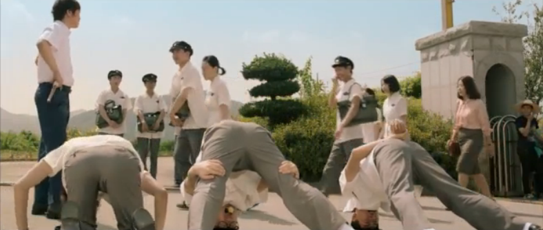 When the three friends finish walking to the end of the train, the losing friend shows everyone the cucumber that he stuck inside of his pants. He wags it around only to accidentally throw it to the teacher sitting near where the three friends are standing. Alarmed and frightened to find a cucumber on her, she starts panicking and yelling which arouses the curiosity of one of the teachers from next door. When he opens the door to find out what’s going on, Choong-gil gets pushed out of the way and lands on the screaming teacher. The guy teacher of course gets mad and infuriated at the sight of a student on a teacher and punishes the three friends as a result. (Choong-gil, this was all your fault to begin with. Haha).