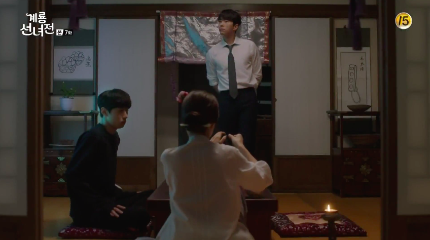 Everything returns to normal with the candles back on so Ok-nam resumes with her plans. She hands Yi-hyun the neck-tie she had bought for him back when she went shopping with Kim Geum. It’s wrapped inside of a pretty and small box. However, Yi-hyun disproves the gift and is reminded of a fearful incident when he was younger related to his mother. He also wishes to never be visited by Ok-nam again in his dreams after he glances at her jade ring resting on the shelf behind them. Yi-hyun storms out of the house and is followed by Kim Geum.