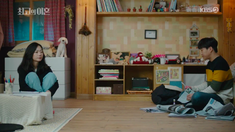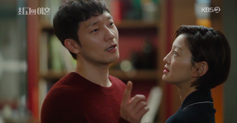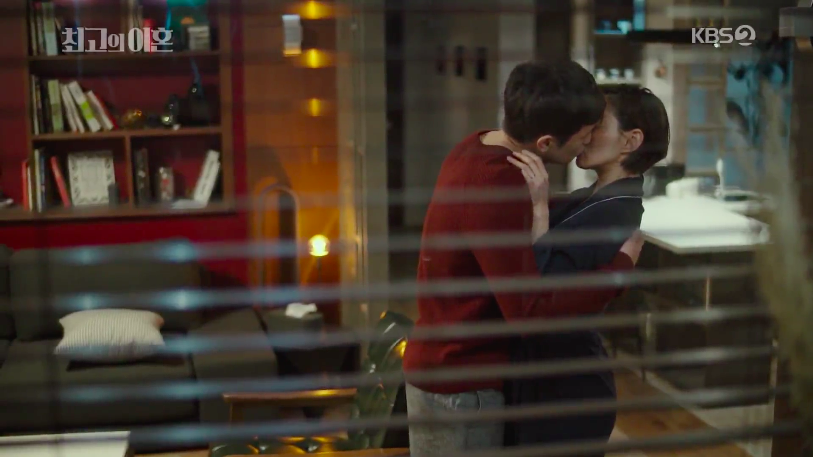 Jang-hyun and Yoo-young have some fun in their apartment. While dancing to some music, Jang-hyun opens up to Yoo-young about one of his biggest fears: a couple hating each other. He hopes to never have to deal with that with Yoo-young. Yoo-young then follows up with a question regarding their marriage registration. Why did Jang-hyun never file it the first time around? Jang-hyun beats around the bush by bringing up the story about his friend’s missing dog, but Yoo-young assumes it was because he was scared. Jang-hyun finally admits that he hated himself while Yoo-young hated herself which means they would have eventually hated each other and he didn’t want that. So how about now? How does he feel about himself now? Jang-hyun answers that he wishes to kiss Yoo-young and leans in to give her a kiss on the lips.