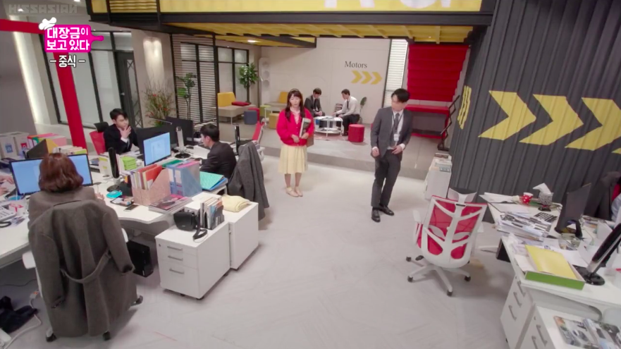 Manager Lee enters the office and is dressed up this time as Suzy from ‘Architecture 101.’ Lol. However, none of the employees can correctly guess from her outfit and Seung-ah even goes as far to claim that Manager Lee is representing the nation’s mother ‘Soo-mi.’ Lol. Eventually, Won Bin guesses correctly after noticing Manager Lee and presents her his report. However, since Seung-ah accidentally spilled some coffee on Won Bin’s report, she is assigned to finish the report. Seung-ah is given only two days to prepare a report and presentation on the analysis of their brand new cars. San-hae offers to help, but Won Bin advises him it’s best he doesn’t get involved.