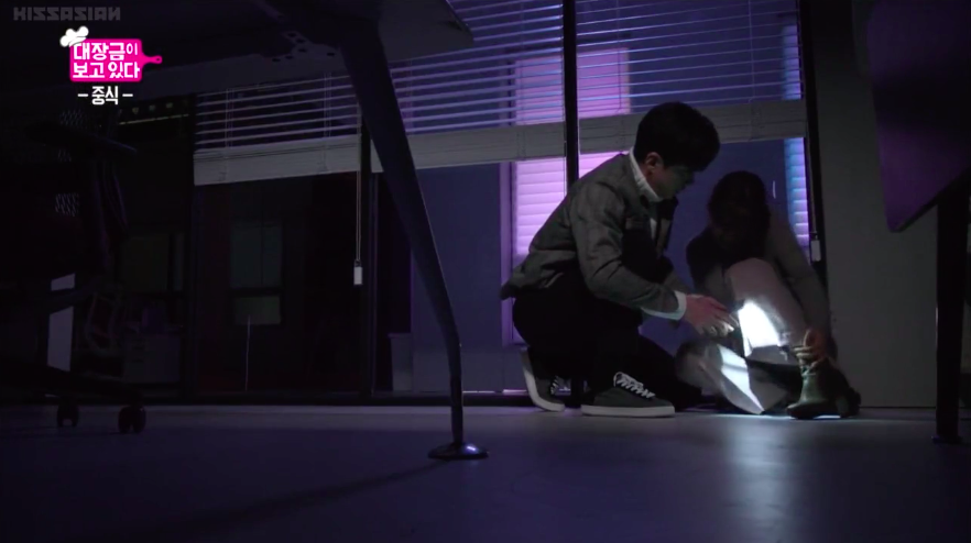 Just as Seung-ah makes her way to Manager Lee’s office, the lights at the building shuts off and the building grows completely dark. Maintenance is conducting an electrical inspection so the lights will be off for half an hour. Seung-ah unfortunately sprains her ankle because of the blackout so San-hae comes to her rescue. However, when he arrives at the office, he also sprains his ankle after attempting to help Seung-ah. LOL.