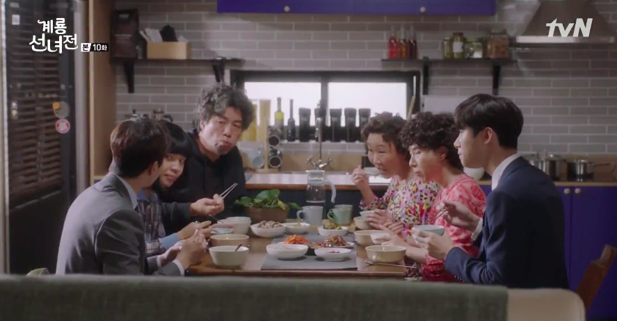 When they all convene for breakfast that morning, Mama Kim strikes up a conversation about how they’ve never met before though they live in such a small village. She and Fairy Oh repeatedly pass the bowl of meat on the table to the man of their preference (Teacher Gu for Mama Kim and Wizard Park for Fairy Oh) until Teacher Gu eventually gets to take a bite out of the bowl, lol. Yi-hyun reveals to the group that he won’t be returning home that night as he’ll be out with Ok-nam. Of course, Kim Geum wants to tag along as well so the two bicker with each other over Ok-nam. Lol.