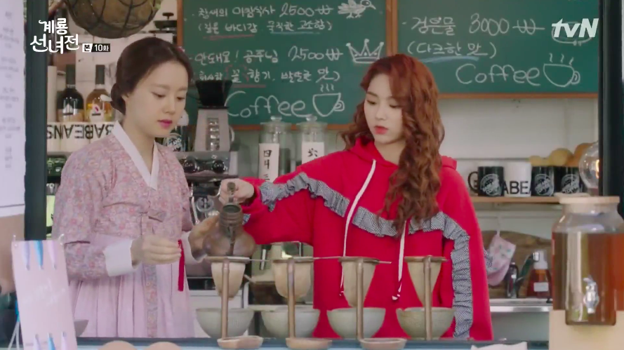 Since Bong-dae isn’t at the coffee shop, Ok-nam trains Jeom-soon on how to brew coffee for customers. It’s clear Jeom-soon is more interested in going out for the day and having some fun than brewing coffee as she repeatedly asks Ok-nam when she’ll return from the trip. Ok-nam scolds Jeom-soon and urges her to just make coffee. Meanwhile, Kim Geum and Yi-hyun rush for the trip. While Kim Geum finishes things up at the lab, Yi-hyun ends his class early and stops by the coffee shop to pick Ok-nam up.