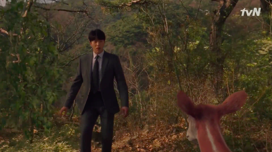 Back at the mountains, our love triangle continue to wander around on different paths and trails. Just as they’re about to leave and return to the car, Yi-hyun finds the same exact cliff that he saw in his vision with the deer. As he walks to the edge of the cliff, the same exact deer approaches him and walks towards him. The deer eventually reveals to Yi-hyun its identity and claims that it is Yi-hyun. Yi-hyun is the deer; the deer is Yi-hyun. Yi-hyun’s foot slips from the edge of the cliff in response to the news and he falls onto the ground.