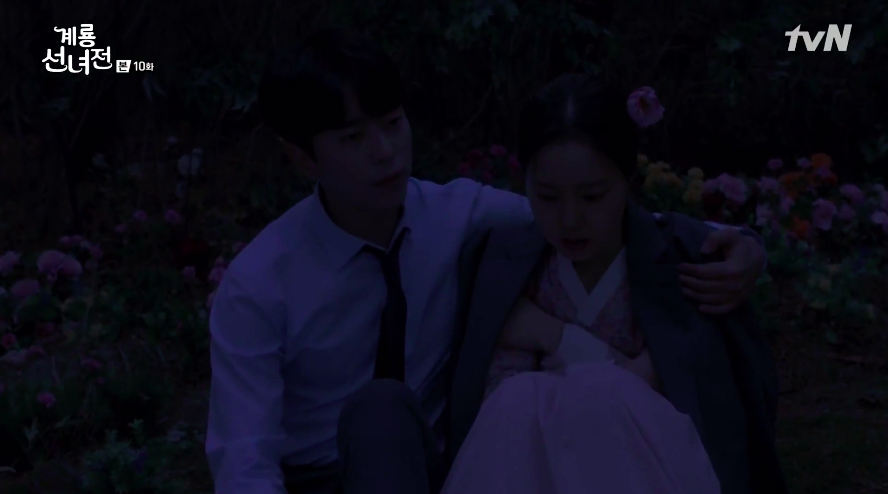 Yi-hyun assumes he’s dead since he’s unable to move, but he’s not. Instead of falling off the edge of a cliff, Yi-hyun had just fallen off a small boulder. However, he’s sprained his ankle so Kim Geum carries him back to the field of flowers they visited earlier. While Ok-nam tends to Yi-hyun’s sprained ankle, Kim Geum cares for Ok-nam and hands her his jacket for her to sit on. Aww.