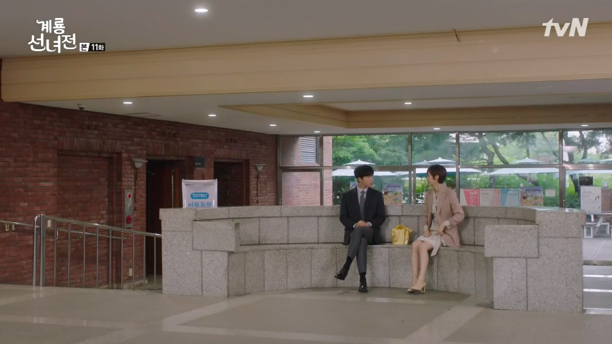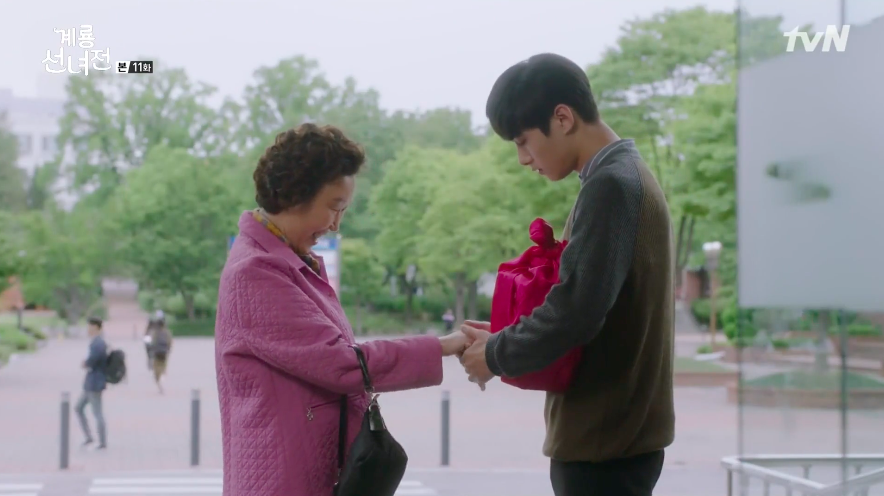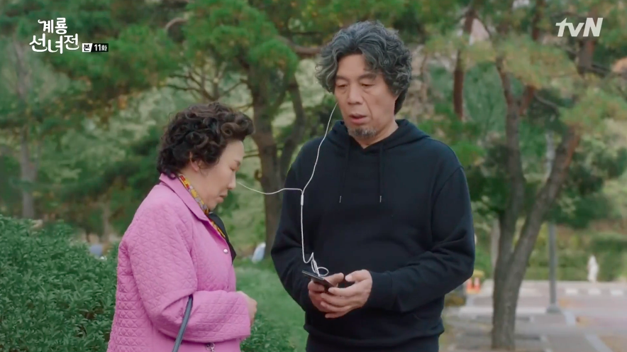 Teacher Gu catches up to Mama Kim wandering around on campus. Upon encountering her, Mama Kim shares with Teacher Gu the song that she was listening to on her phone. At that moment, Professor Park calls Mama Kim, but Mama Kim and Teacher Gu assumes his voice is a part of the song (“is this the rap that Jeom-soon was talking about?” LOL). Professor Park grows angry and hangs up. Jeom-soon herself is also agitated when Gyeong-sul fails to show up to their date. She assumes he must not like her anymore.