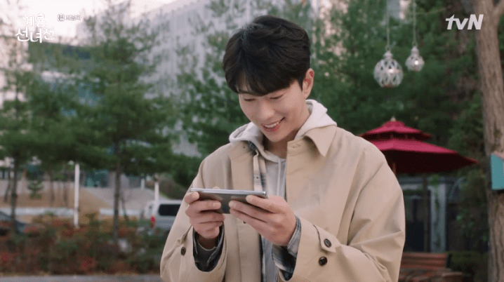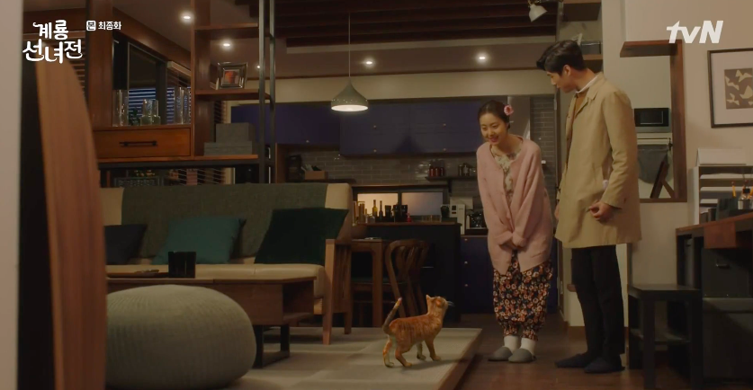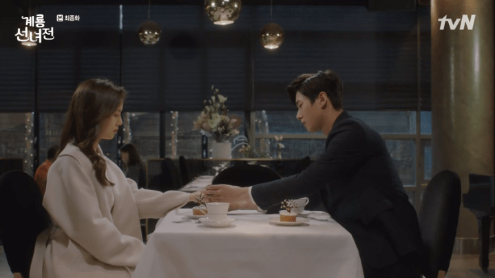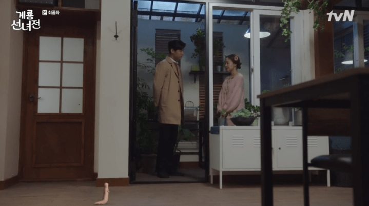 The next morning, Fairy Oh and Wizard Park prep for the Chuseok Holidays. They also converse about Teacher Gu who they realize isn’t present with them. It turns out he’s busy on a trip with Mama Kim now that Ok-nam has returned to the human realm to take care of Kim Geum. In an earlier conversation, Mama Kim shared a story with Ok-nam about Kim Geum when he was a child. She thanks Ok-nam for liking her son and asks that she take good care of him in the future. Speaking of Kim Geum, he returns to the fairy cafe with some presents for everyone. He also gifts Ok-nam with some flowers and silently rejoices at the sight of the ring on Ok-nam’s fingers. Eeeeeek!