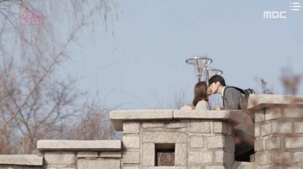 The final episode begins with us transitioning one year later. San-hae finds himself late for work after staying up late to talk to Seung-ah on the phone. He rushes to work without eating any breakfast with his bickering siblings and then is suddenly pulled aside by Seung-ah after exiting the elevator at his work building. The two hide themselves and give each other some adorable kisses before heading to work. Hehe.
