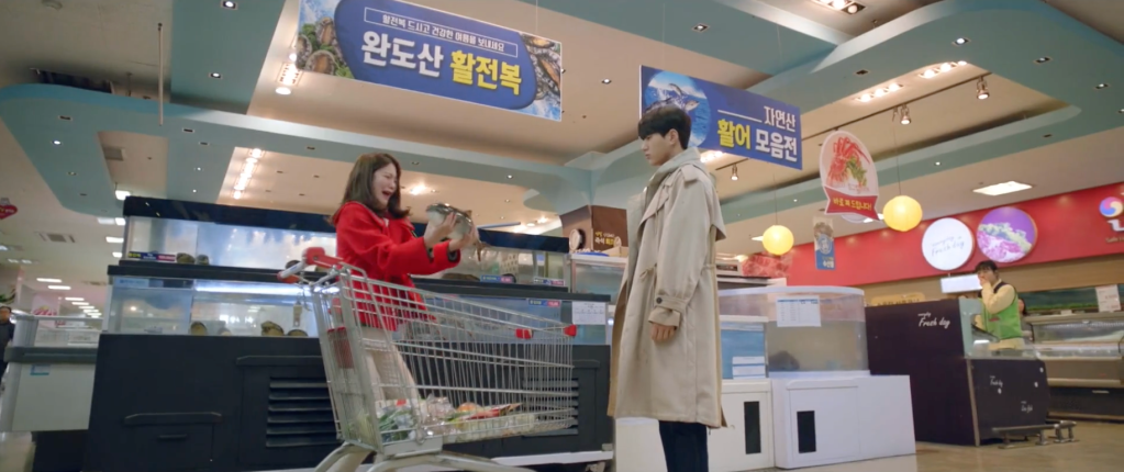 Sol-Ah talks things over with best friend Doo-sik. Guk-bong – who Sol-Ah is referring to human Hong-jo as – seems a little weird. She doesn’t have good vibes about him. To ease her concern and worries, Doo-sik and Jae-sun volunteers to come over that night to interact with this Guk-bong guy to see what he’s like. Sol-Ah prepares for the visit by cleaning up the house and assigning Hong-jo to assist her with duties. When that doesn’t seem to go too well, Sol-Ah has no choice but to let Hong-jo go with her to the grocery store. Even that is troublesome in itself as Hong-jo has no money to pay for things and well.. gets excited over fish – alive or not. LOL.