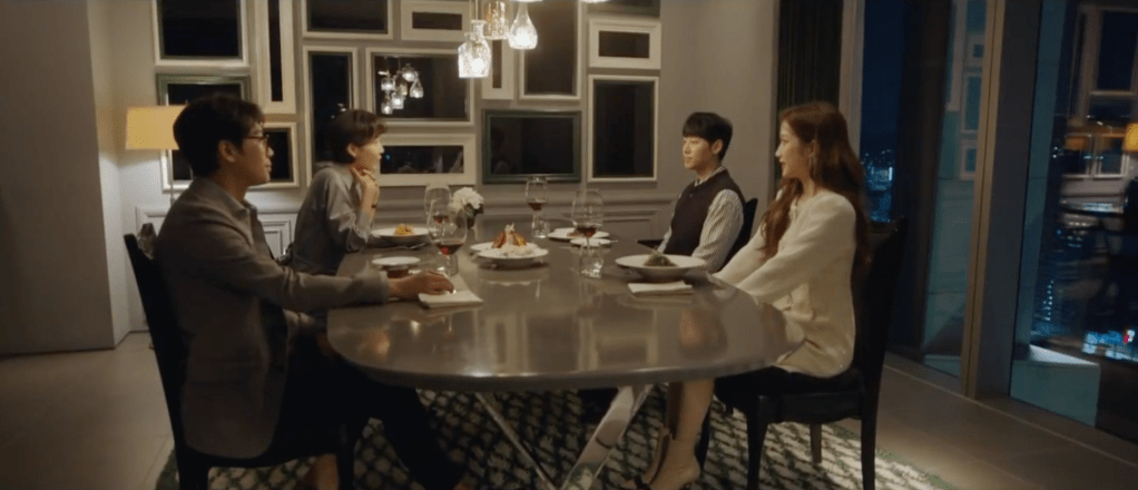 Ha-jin searches for a pair of earrings that she can’t seem to find in her closet. After finding a new pair to wear, she heads out with Jung-hoon for a dinner get-together with the writer and director of Ha-jin’s upcoming drama. Everything seems to be going fine until Ha-jin almost eats some shrimp which she’s allergic to. Fortunately, Jung-hoon stops her just in time thanks to a memory he recalled of Seo-yeon telling him about Ha-jin’s allergy to shrimp. Jung-hoon excuses himself to use the restroom while the writer – Writer Hwang (Shin Dong-mi) – takes a call outside of the room. Ha-jin is left alone with the director who isn’t so happy with Ha-jin’s casting. He had wanted another actress to play the role and insists that Ha-jin withdraw from the drama. Jung-hoon overhears the harsh conversation as he returns to the room. Once all four are reunited again, he follows up with Writer Hwang as to whether Ha-jin received the role as a news anchor because of her connections with Jung-hoon. While Writer Hwang fervently denies such accusations, Ha-jin can’t help but feel overwise.