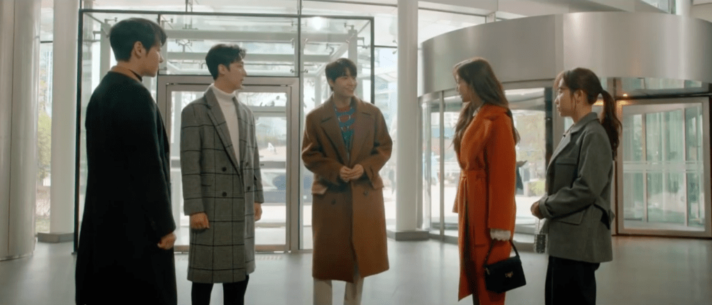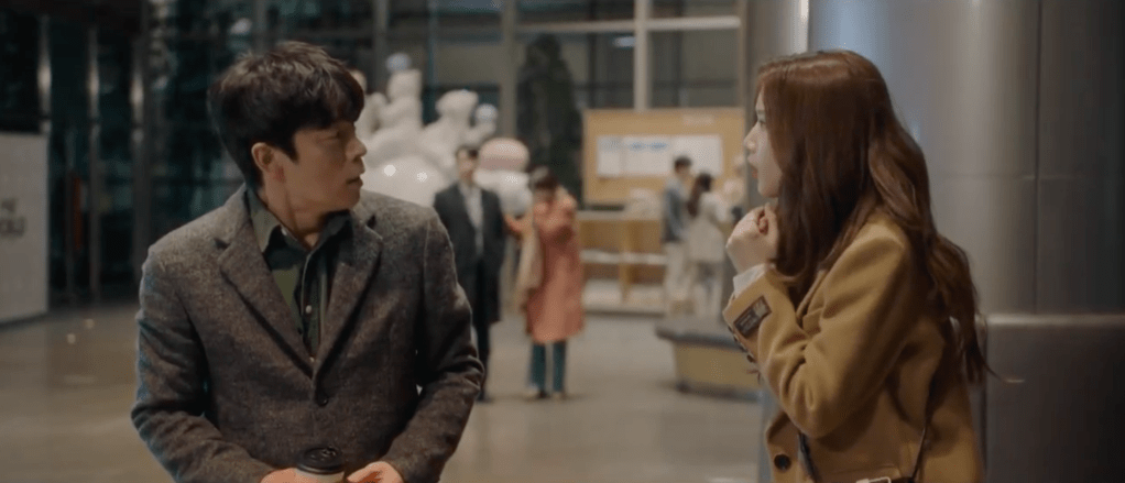 Jung-hoon and Director Choi come across CEO Park, Ha-kyung, and Ha-jin at the broadcasting station building. They exchange greetings and make plans for Ha-jin to visit the next day to do some research in preparation for her character as a news anchor. The two groups eventually bid farewell, but Jung-hoon can’t seem to shake off the odd vibes he’s catching from Moon Chul who greets Ha-jin and the group a few seconds later. Something seems off about him.