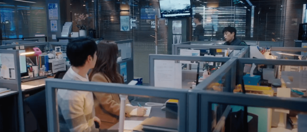 It’s time for Ha-jin to do some research at Jung-hoon’s workplace. After getting a tour of the control room by Il-kwon, Ha-jin situates herself in the staff room and sits in a cubicle right across from Jung-hoon. After sneaking some peaks and glances at him, Ha-jin is finally allowed to sit next to him to go over the process of news reporting. Technical Director Kim awakens from his nap not too far away and rumbles on and on about the two being lovey dovey with each other in the staff room. LOL, he’s too funny.