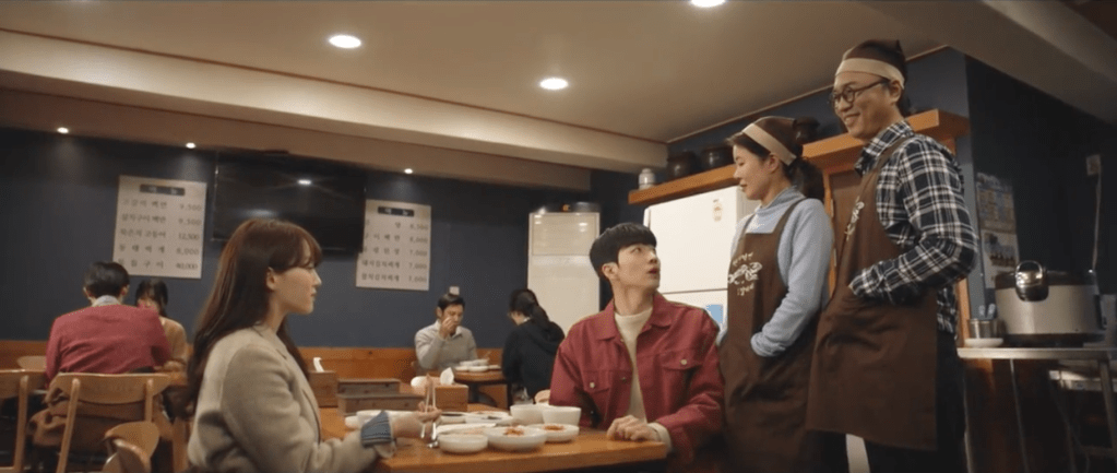 After work that night, Ji-eun finds herself at the same bus station as Doo-sik. She hides herself to be out of his sight, but she seems happy just to be at the same bus stop at him. Since they live near each other, they hop on the same bus to go home together. Once inside the bus, Doo-sik sits in front of Ji-eun, but he can’t stop turning around to stare talk to her. He proposes they grab some dinner since he’s feeling hungry. So they make a stop at none other than his parent’s restaurant! Hahaha, omg, I’m loving this. Doo-sik’s parents freak out at the sight of their son bringing Ji-eun to the restaurant so they pay close attention to her — maybe a little too close. They stand right next to their table as Ji-eun and Doo-sik eat and asks Ji-eun a bunch of questions about her and her family. Ji-eun eventually cracks a joke during the conversation, but Doo-sik’s parents struggle to understand Ji-eun’s sense of humor. Doo-sik sort of finds it adorable though. Hehe.