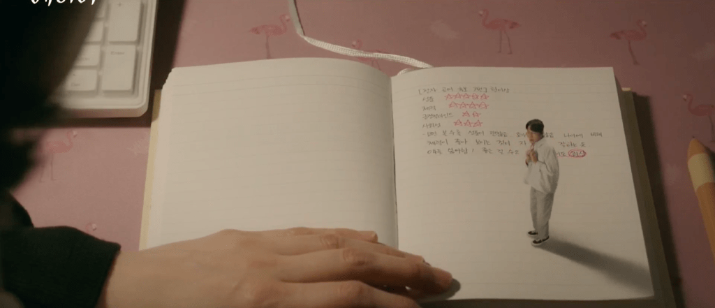 Eun-young reasons that things could change for Ha-ri like how it did for her sister who managed to find a great and loving husband. Speaking of her brother-in-law, Eun-young witnesses him at the same grocery store with another woman who isn’t her sister. Uh-oh. Eun-young chases him throughout the grocery store after witnessing him cheating. Using Eun-young’s life to motherhood as a learning lesson, Ha-ri is convinced that she needs to do something about her situation and at least start somewhere. While journaling that night, she lists out different traits to each of the guys she’s seeking as her possible contender and compares and contrasts each of them.