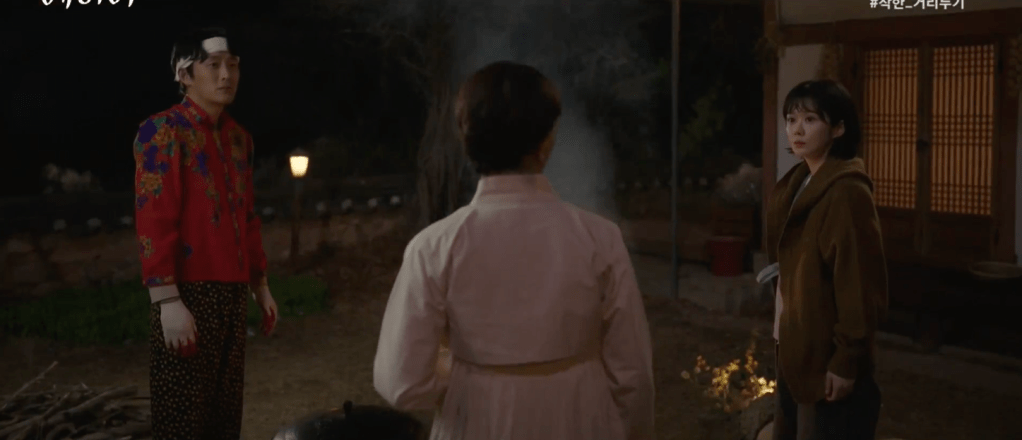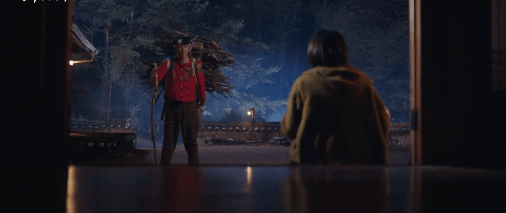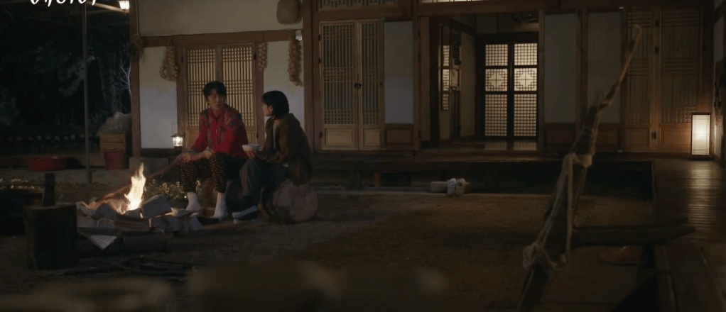 Except well… that is their only option. LOL. With nothing opened at the moment, Ha-ri and Yi-sang have no choice but to spend the night at an older and more traditional location run by a scary elder that frightens Yi-sang. He rather sleep in the car, LOL. But the elder is keen on getting them to stay so she gives them three rooms to use and even offers them some clothes to change in. Ha-ri and Yi-sang eventually adjust to their new situation and begins to cook some food for them to eat. Yi-sang returns with a batch of firewood logs that they could use to heat up their food and even start a fire afterwards (omg this is too funny, I can’t). Ha-ri watches in amazement as Yi-sang uses his skills to impress her get some cooking going for the two.