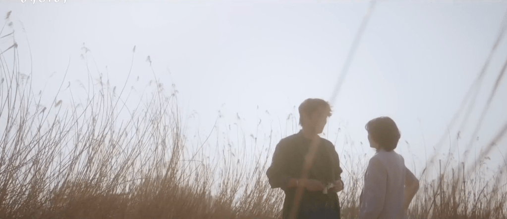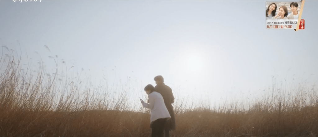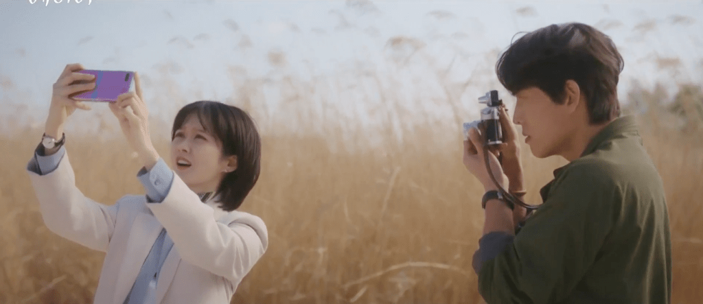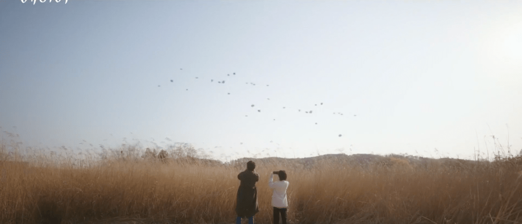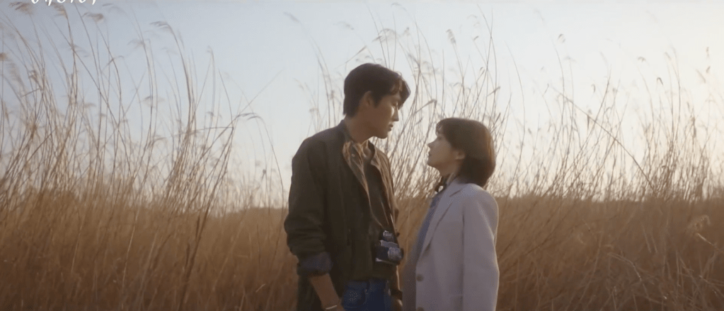 The next morning, Ha-ri gets ready to find Yi-sang already changed and gone. She finds him hidden in a field full of tall grass taking photos of some birds. Ha-ri joins him shortly afterwards and the two take some photos. While Yi-sang initially starts off with taking photos of the birds, he also catches a few snapshots of Ha-ri as she’s distracted on her phone. With the strong wind blowing in their face, Ha-ri takes refuge behind Yi-sang’s huge back. The two play around and tease each other by taking turns hiding behind each other’s backs, but the teasing stops once they find themselves standing across from each other. Ha-ri nervously takes a step forward towards Yi-sang and waits for him to make his move. Yi-sang then leans down towards Ha-ri and the space between the two grows smaller and smaller. They’re inches away from a kiss.