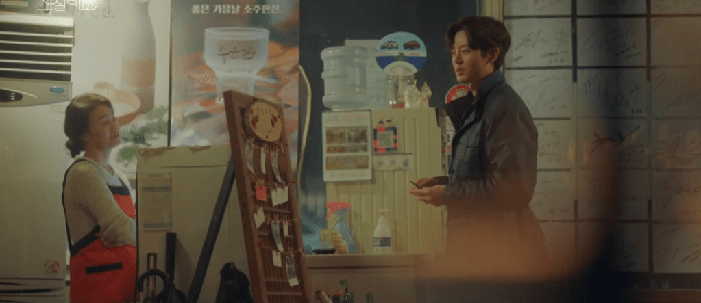 Fast forward to the present and Do-hee’s first love, Jae-hyuk, visits the same exact spots that she showed Hae-kyung. He stops at the fish market to grab a rice bowl and then also munches on it at the same rooftop that he and Do-hee would frequent back when they were dating. Back at the restaurant, Do-hee wraps up her first love story to Hae-kyung and expresses her misery and disappointment in how her first love story concluded. She didn’t experience a happy first love relationship at all unlike others. Hae-kyung can easily relate to Do-hee as his relationship with his first love wasn’t the greatest or happiest either. Do-hee whispers the word ‘jerk’ under her breath a few times, confusing Hae-kyung on who she’s referring to. Haha. Do-hee has to clarify a few times that she wasn’t speaking to Hae-kyung directly. Lol, they’re too cute.