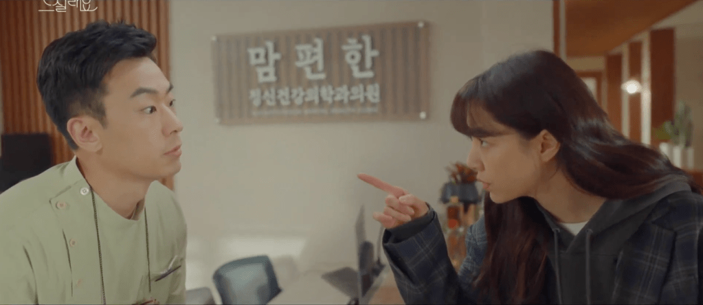 Hae-kyung arrives at the ‘Moon River’ destination that was noted on Byung-jin’s desk. Upon arriving, he’s reminded of the exact moment years ago when he visited the same cafe. Back then, he met up with No-eul who had wanted to break up with him. He was boring and she had fallen out of love with him. His desperate plea for her to stay with him was futile for she had already made up her mind. Fast forward to the present and No-eul is sitting at the same exact table in front of Hae-kyung again. However, things are the opposite now and she wishes to get back together with Hae-kyung. She wants to give their relationship another try. What Hae-kyung had thought was a counseling session with a patient turned out to be a meeting with No-eul who had booked the appointment under a fake name so that they could meet. Hae-kyung is taken aback by the abruptness of it all.