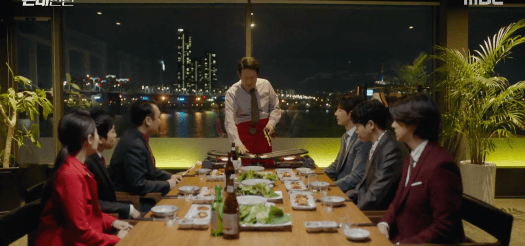 And so it’s time for Yeol-chan and his team to work their magic. Along with Seung-jin, Assistant Manager Oh, and Man-sik, the four have dinner with their Chinese client, Mr. Binghao, and his team to seal a deal with them. With them primarily speaking and communicating in Mandarin, Man-sik feels excluded and left out since he isn’t familiar with the language. As if that wasn’t humiliating enough, Yeol-chan brought along Man-sik purely just so he can grill some meat for them to eat. And so Man-sik does as he is instructed and he begins to cook the pork belly. However, he takes full advantage of the opportunity and purposely makes mistakes while grilling the meat. Lol. He splats the oil from the meat onto Mr. Binghao’s face on purpose to irritate him. Man-sik is reminded of a conversation he had with Executive Ahn prior to the dinner: he has to do whatever he can to make sure the deal doesn’t happen. That’s his number one goal with this meeting.