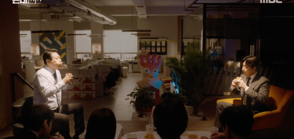 And so the dinner party comes to a close and our Sales and Marketing team seals the deal with Mr. Binghao and his team the next morning. Right as they bid farewell with their client, Mr. Binghao surprises everyone by giving Man-sik a hug and calling him by his name. Man-sik was primarily the one who persuaded Mr. Binghao to sign the contract with Joonsoo Foods. As we would learn and witness, Man-sik saved Mr. Binghao while he was choking the night before so Mr. Binghao went through with signing the contract as a token of his appreciation. When everyone is reunited at the office, they learn that it was Man-sik who managed to get the deal and not Yeol-chan like they had expected. While feasting on some burgers for lunch, Yeol-chan and Man-sik engage in an intense staring contest as if they’re in some sort of eating competition.