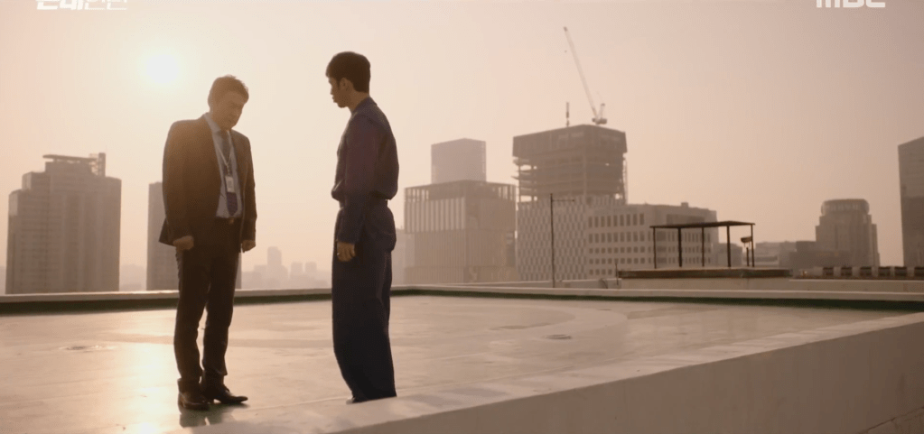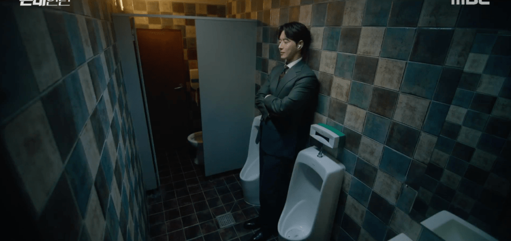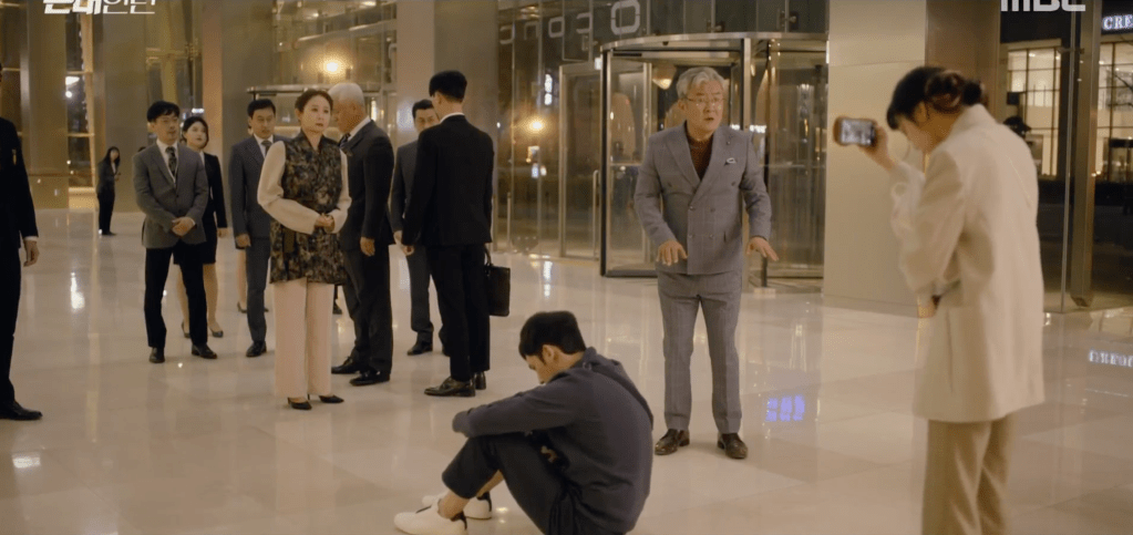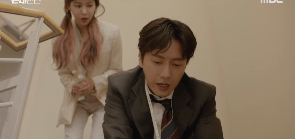 Yeol-chan exits the office with Chairman Namgoong, Joon-soo, and the rest of the staff. He’s humiliated by Chairman Namgoong when the Chairman questions how he was unable to get the contract deal. It seems like he’s falling behind the senior intern who just barely started at the company. Chairman Namgoong whispers something into Yeol-chan’s ear which pushes Yeol-chan to walk away from the rest of the group. A concerned Tae-ri observes the intense situation from behind. After getting away from everyone else, Yeol-chan hides himself on a plight of stairs and suffers from a panic attack. Similar to earlier that day, Tae-ri checks up on Yeol-chan to see if he’s okay, but he shouts at Tae-ri to go away. With Tae-ri gone, Yeol-chan vows to get back at Man-sik.
