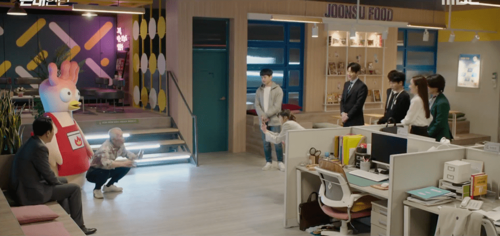 After hearing Assistant Manager Oh and Seung-jin gossip about Yeol-chan in the restroom, Yeol-chan’s anger and rivalry against Man-sik intensifies. While walking back to his desk, he devises a new game plan in order to win against Man-sik: he’s going to need to deal with him at a higher level. Yeol-chan’s made a mistake because of Man-sik so he needs to step his game up. Stressed and exhausted, Yeol-chan leans over onto his desk to process his emotions. A concerned Tae-ri approaches him and checks up on him only to scare him even more. He appreciates the concern, but her blue lips from the candy she’s been eating makes him jump up from his desk. Lol. While memorizing everyone’s coffee orders, Man-sik receives a call from Joon-soo.
