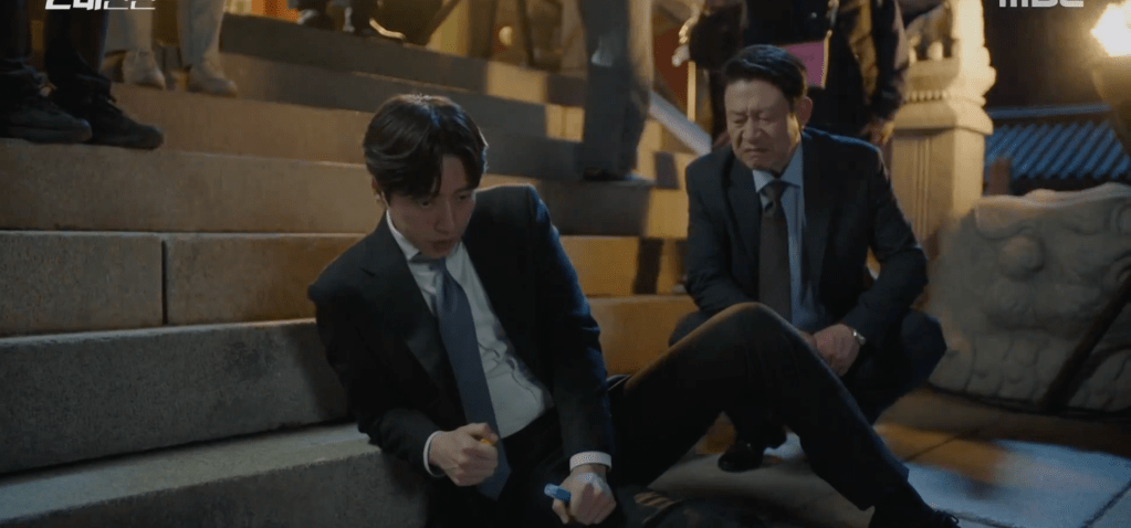 Thankfully, Man-sik is alive. While being carried on Yeol-chan’s back, Man-sik mutters in his ears about the incident involving the man at the ox head rice soup restaurant five years ago. Unlike what Yeol-chan thought, the owner of the restaurant isn’t actually dead. He didn’t shoot himself like how Yeol-chan thought he did. Yeol-chan stops running upon learning the truth and he even drops Man-sik onto the ground. The two men exchange glances at each other in silence. Yeol-chan is speechless.