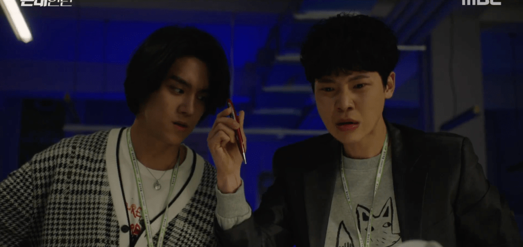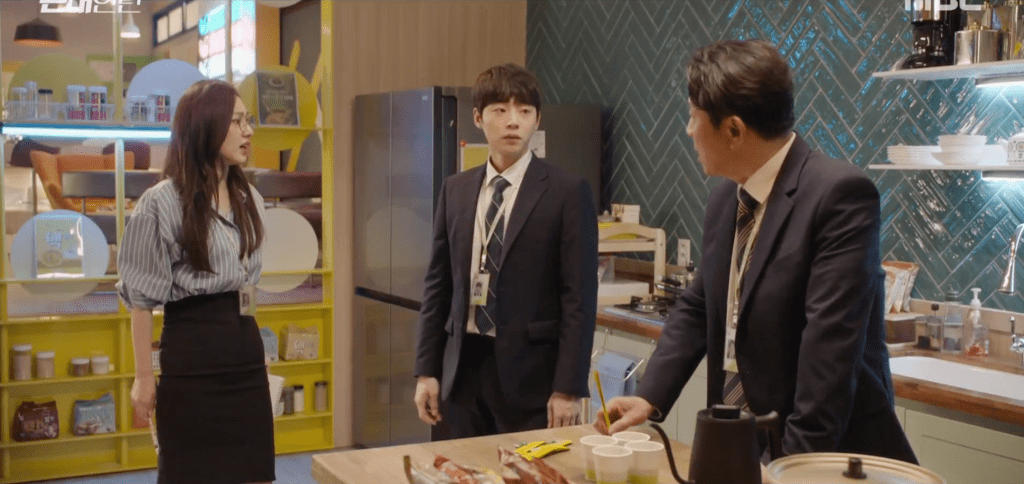 An audio recording of Man-sik sharing his idea about the dried pollack ramen to Assistant Manager Oh appears on the community forum the next day. Someone had secretly recorded the conversation between the two and uploaded it. Man-sik confronts them about the recording and proves that he was right about the idea being his. However, Yeol-chan steps in to defend Assistant Manager Oh. Just because Man-sik shared the idea verbally doesn’t mean it was his idea. To truly claim an idea as yours, you should also write up a complete proposal and present it. Later on that night after work concludes, Assistant Manager Oh and Seung-jin stay behind to search for a recording device. Since Yoon-soo and Tae-ri were the only ones in the office during that time with Assistant Manager Oh and Man-sik, they ramble through their desks to find something. Assistant Manager Oh eventually discovers a recording device disguised as a pen on Tae-ri’s desk and assumes she was the one who recorded his conversation with Man-sik.