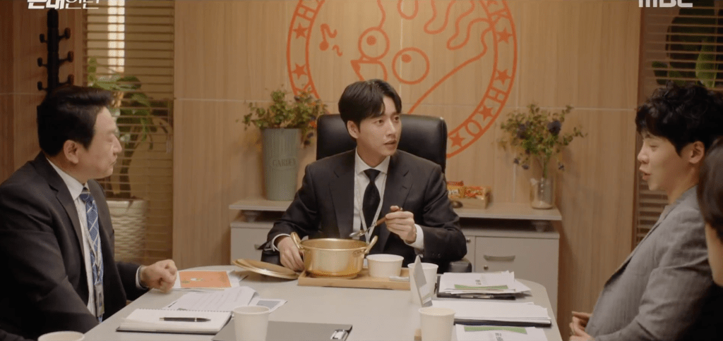 Yeol-chan reviews everyone’s proposals during their next staff meeting. However, it’s ultimately Man-sik’s idea who he likes the most. Of course, since Assistant Manager Oh wrote up the proposal himself, he takes the credit for the dried pollack ramen noodles that Yeol-chan approves of. In an effort to prove that the idea was actually his, Man-sik puts both Tae-ri and Yoon-soo on the spot since they were there when Man-sik explained his idea to Assistant Manager Oh. Although Yoon-soo was present during that time and was paying attention to Man-sik and Assistant Manager Oh’s conversation, he lies that Assistant Manager Oh didn’t steal Man-sik’s idea. Man-sik is in disbelief and he refuses to interact with the rest of the team for lunch. Yeol-chan returns to the office where Man-sik is stationed and checks in with him. When Man-sik doesn’t respond, Yeol-chan carelessly walks away.