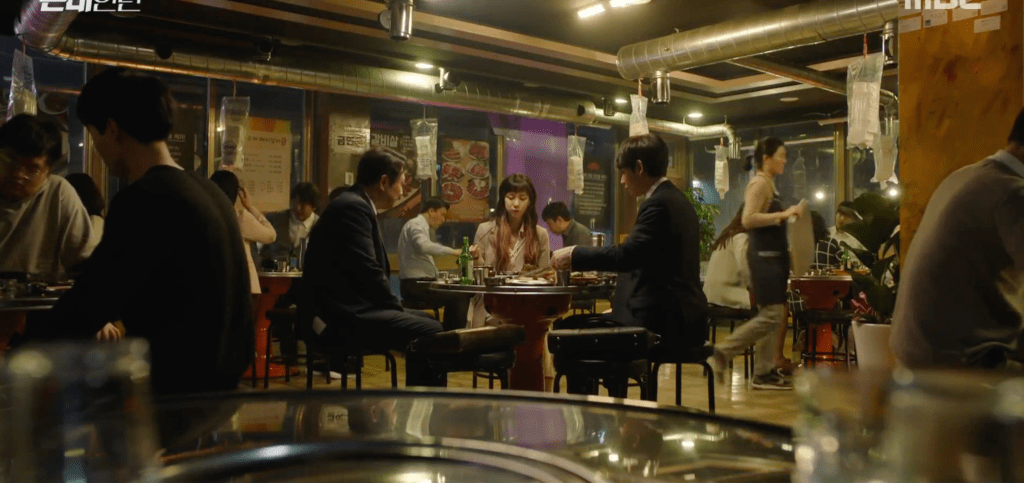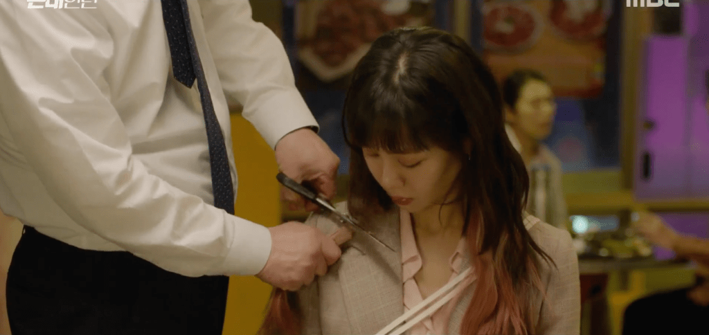 Although our three interns have dinner together, they don’t seem to get along too well. Yoon-soo is busy minding his own business and somewhat listening to Man-sik’s blabbering, Man-sik is busy lecturing and nagging the two much younger interns, and Tae-ri is busy feasting on the food. Hours into the dinner and Man-sik has had a little too much to drink. He’s still not a big fan of Tae-ri’s dyed hair so he ends up cutting one side off with a scissor. Omg, LOL. After the get-together, Yoon-soo and Tae-ri exit the restaurant together. Tae-ri now has a side of her hair cut short, but she tries not to think about it too much. When asked if Tae-ri was the one who actually recorded the conversation between Assistant Manager Oh and Man-sik, she grows confused. That was the primary reason as to why Man-sik treated them out to dinner. If it wasn’t Tae-ri who recorded the conversation, then who did?