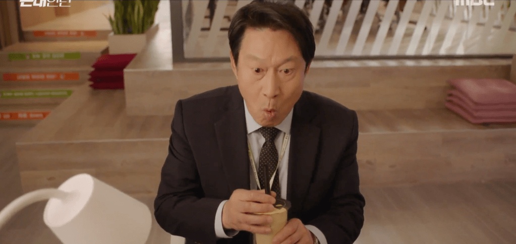 The next morning, Yeol-chan prepares to make the announcement of Man-sik’s resignation to his team. However, just as he’s about to say something, he receives a text from Man-sik who apologizes for the incident the night before. The senior intern enters the office shortly after sending the text message and dramatically apologizes for his actions by getting onto his knees in front of everyone. To make up for what happened the day before, Man-sik offers to buy everyone coffee. He’s memorized everyone’s orders, including Yeol-chan’s complicated one. Haha. However, Yeol-chan decides to shake things up by suggesting a different drink. He wants some milk tea so he has Man-sik get them some drinks from a nearby milk tea shop. Just like with coffee, Yeol-chan has a complicated and meticulous order so Man-sik has to resort to recording it so he can order correctly. Lol. He even has to shake Yeol-chan’s drink for 15 seconds before his boss can drink it. Haha. Finally! Some beverage diversity in dramas other than coffee and alcohol! Milk tea, FTW!! (And also, the milk tea looks sooo good!).
