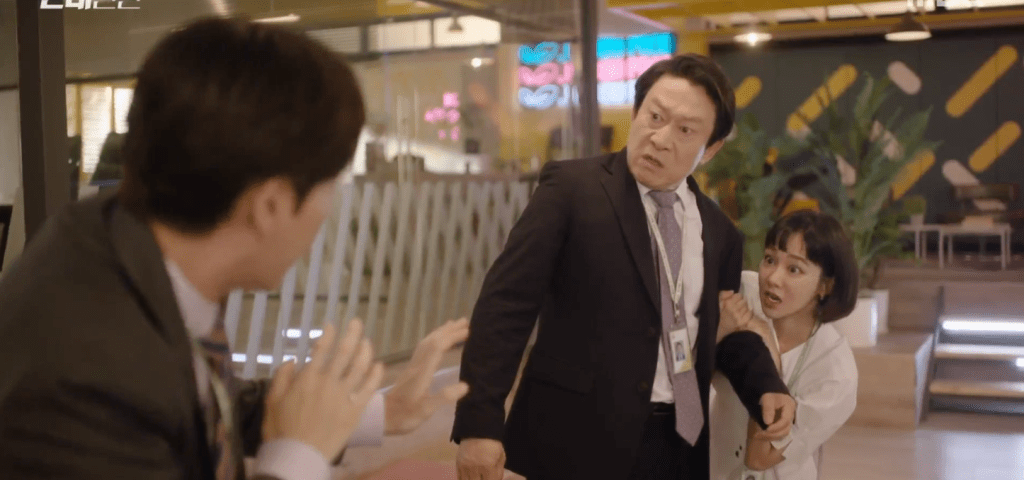 The episode starts off by giving us details and context on Tae-ri’s life prior to interning at Joonsoo Foods. She disliked her job at her former workplace and quit just a few months in. Of course, Dad Man-sik disproved of her decision to quit and nagged at her to find a job that would help her become financially stable. However, with Tae-ri’s bad history with her former boss, it was difficult for her to find a job. That’s when Tae-ri decided to start anew and apply for an internship with Joonsoo Foods. Of course, she had no idea that her dad would too be applying for the same internship program and they only found out once it was the first day of the internship. Upon seeing each other, they agreed to pretend as if they didn’t know each other. They might be family on paper, but they’re as good as strangers in real life. So throughout the many months of the internship, Tae-ri and Man-sik kept it a secret that they were father and daughter. However, the secret was bound to be revealed and it was Tae-ri’s mom who made the grand revelation in front of everyone at the office.