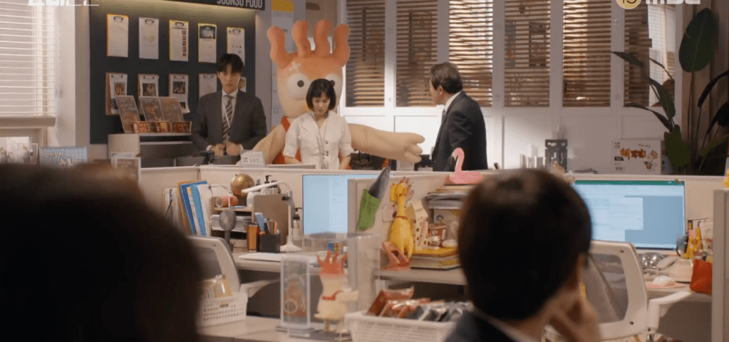 At that moment, Man-sik himself enters the room upon overhearing Yeol-chan say ‘father-in-law.’ Dating? His daughter and Yeol-chan? He explodes upon learning about Yeol-chan and Tae-ri’s relationship and begins to attack the General Manager furiously outside in the office. Jung-eun, Yoon-soo, Seung-jin, and Assistant Manager Oh watch as Man-sik yell at Yeol-chan for trying to date his daughter. Tae-ri holds her dad back from charging at Yeol-chan and even defends her boss. She’s already sorry enough for smooching him and then rejecting him afterwards, can her dad just stop? But the words ‘smooching’ only infuriates Man-sik even more and even the spicy chicken ramen mascot has to step in to protect our team leader. The rest of the four watch in fascination; it’s like watching a makjang drama come to life. Haha.