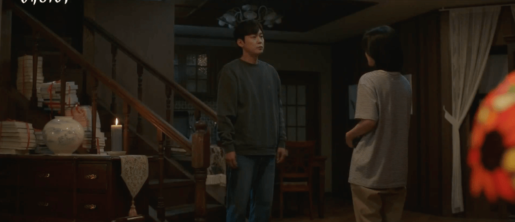 When Ha-ri arrives home that night, she learns from Jae-young that Mom’s gone on a trip with her hiking club. Ha-ri just finds it suspicious that they went out mid-week since they usually never do. The two also have an awkward chat about baby Do-Ah. Jae-young answers that she’s spending some time with her mom for a few days so it’s just him alone. The two housemates eventually separate and go their own ways, but reunite shortly afterwards when the electricity shuts off that night. While searching for some candles, Ha-ri almost falls, but is fortunately caught by Jae-young who grabs onto her arm just in time to protect her from falling. The search for the candle resumes and they eventually keep each other company while in the dark.